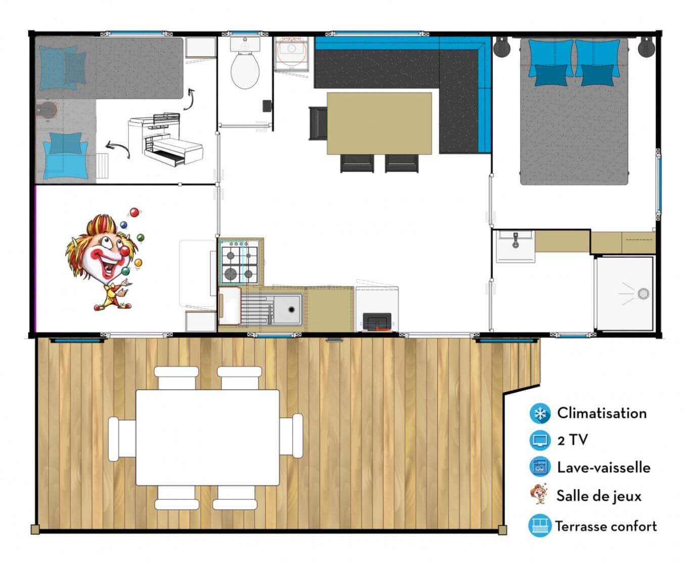- 3 couchages (1 lit simple en hauteur et 2 lits simples)